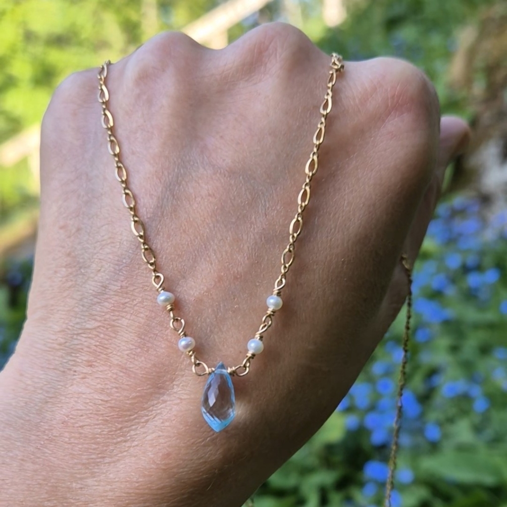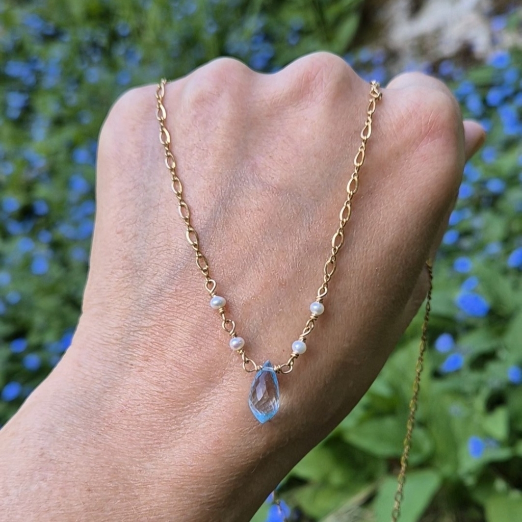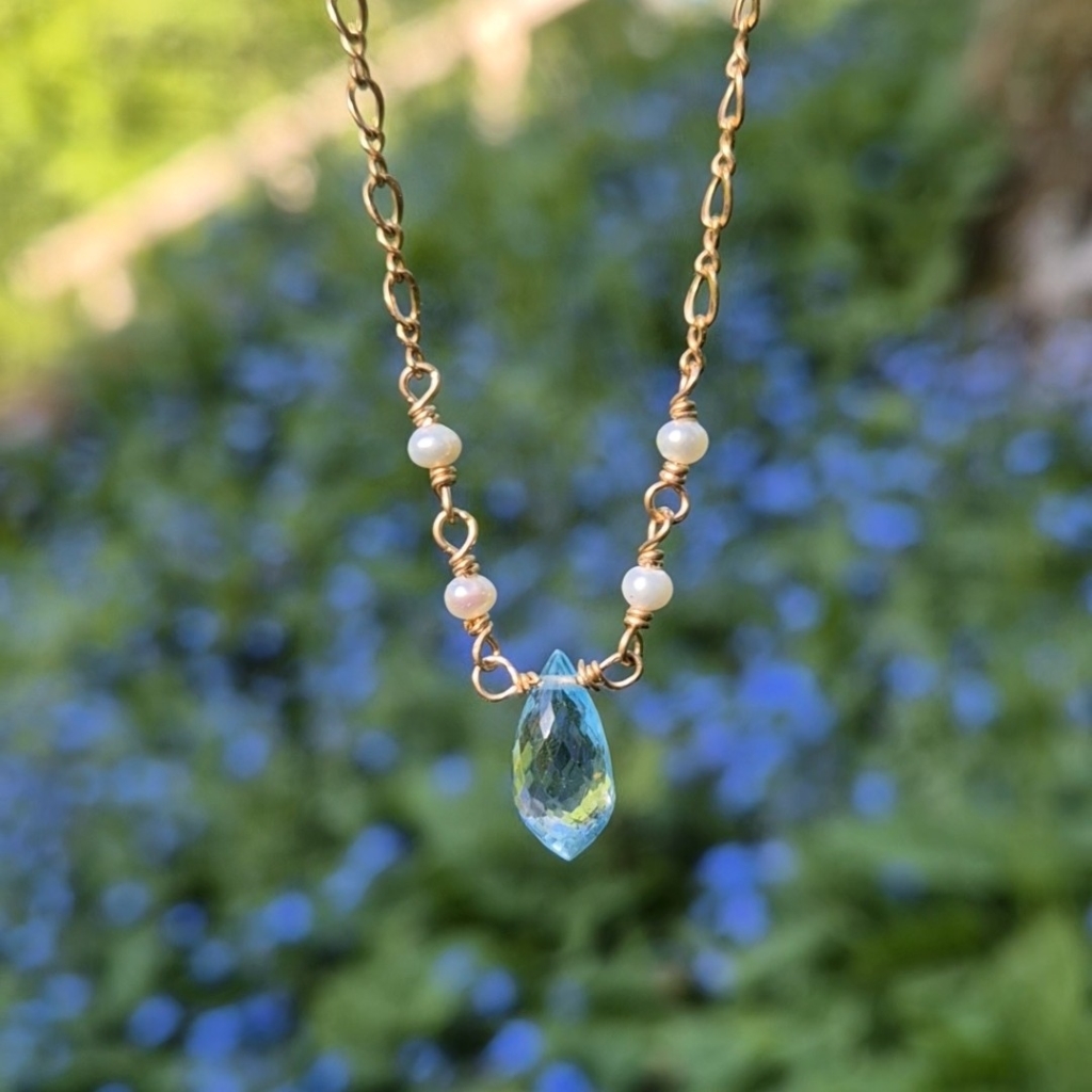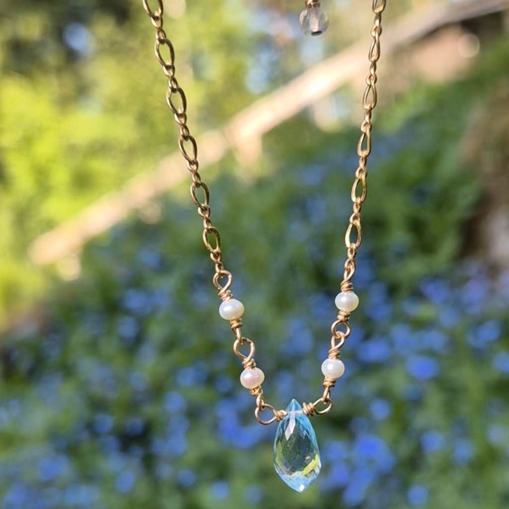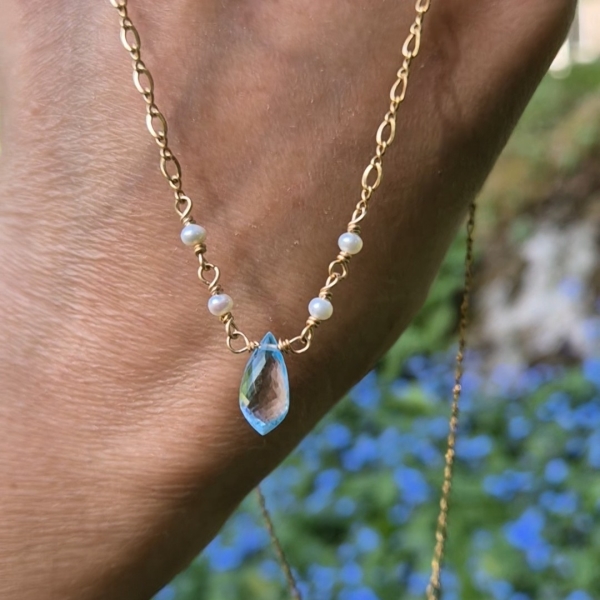 Halskjede med senterpunkt av sjelden og svært klar lyseblå Topaz av nydelig kvalitet. Det er av 14 Karat Gold-Filled, som er hyper-allergi vennlig og gir et tilnærmet evigvarende lag med gull.