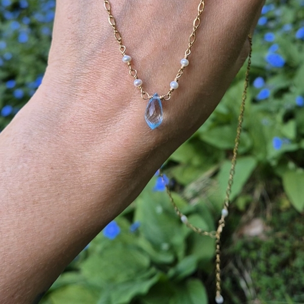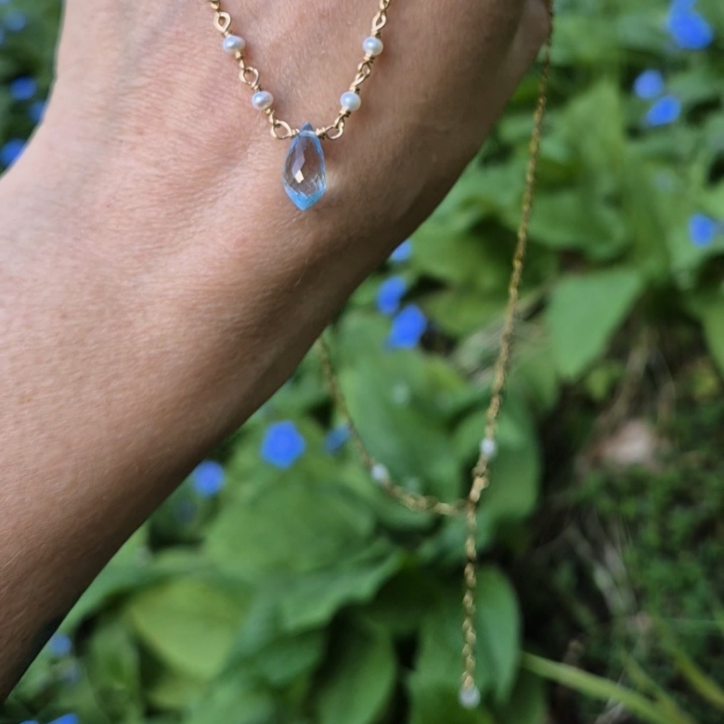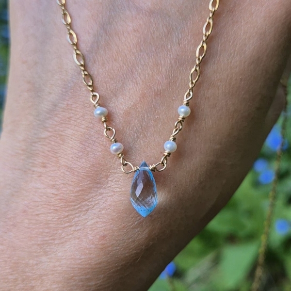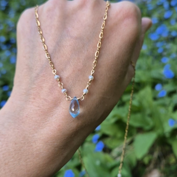 Halskjede med senterpunkt av sjelden og svært klar lyseblå Topaz av nydelig kvalitet. Det er av 14 Karat Gold-Filled, som er hyper-allergi vennlig og gir et tilnærmet evigvarende lag med gull.