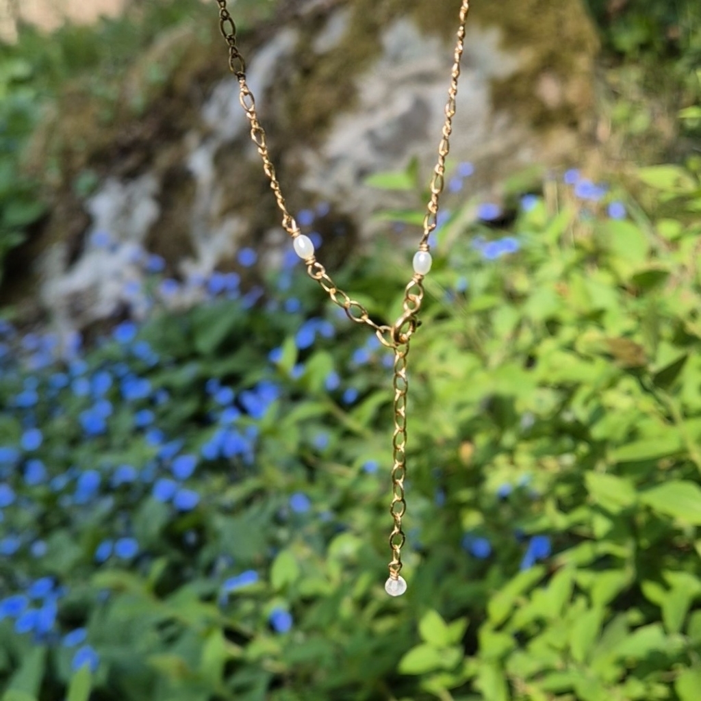 Du finner små hvite Perler både ved steinen og ved låsen. Kjedet har regularbar lengde 46.5 til 52 cm.