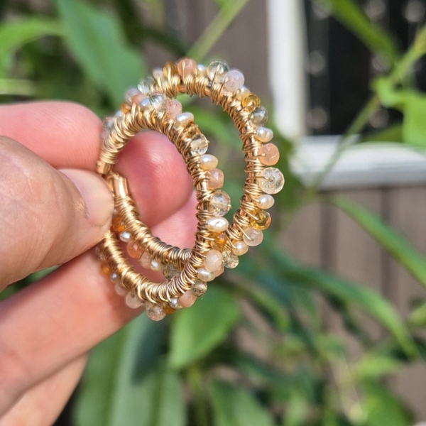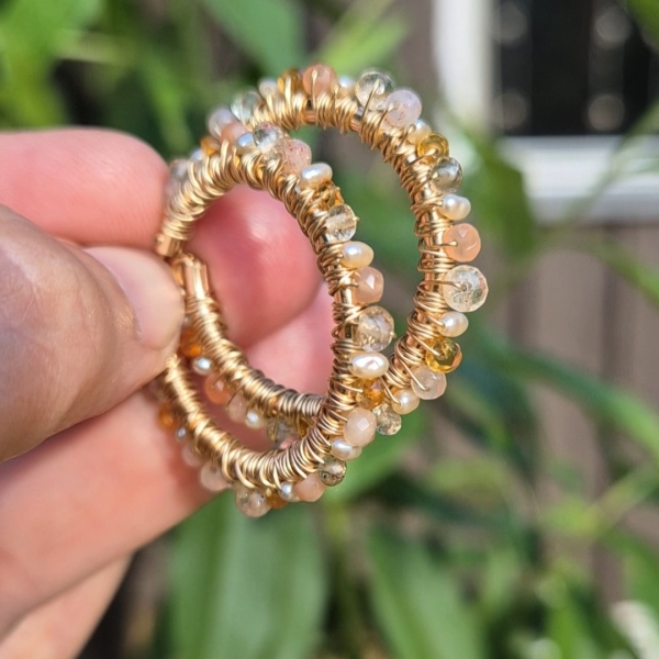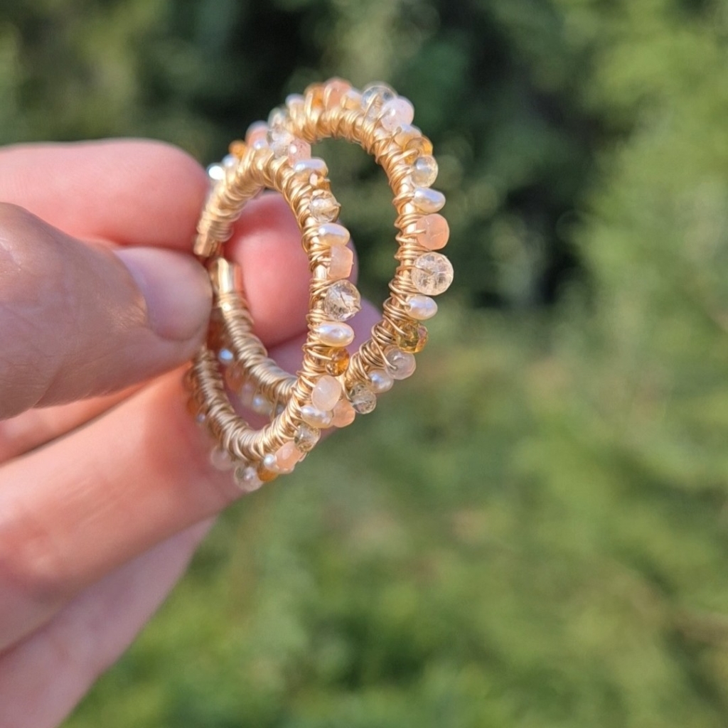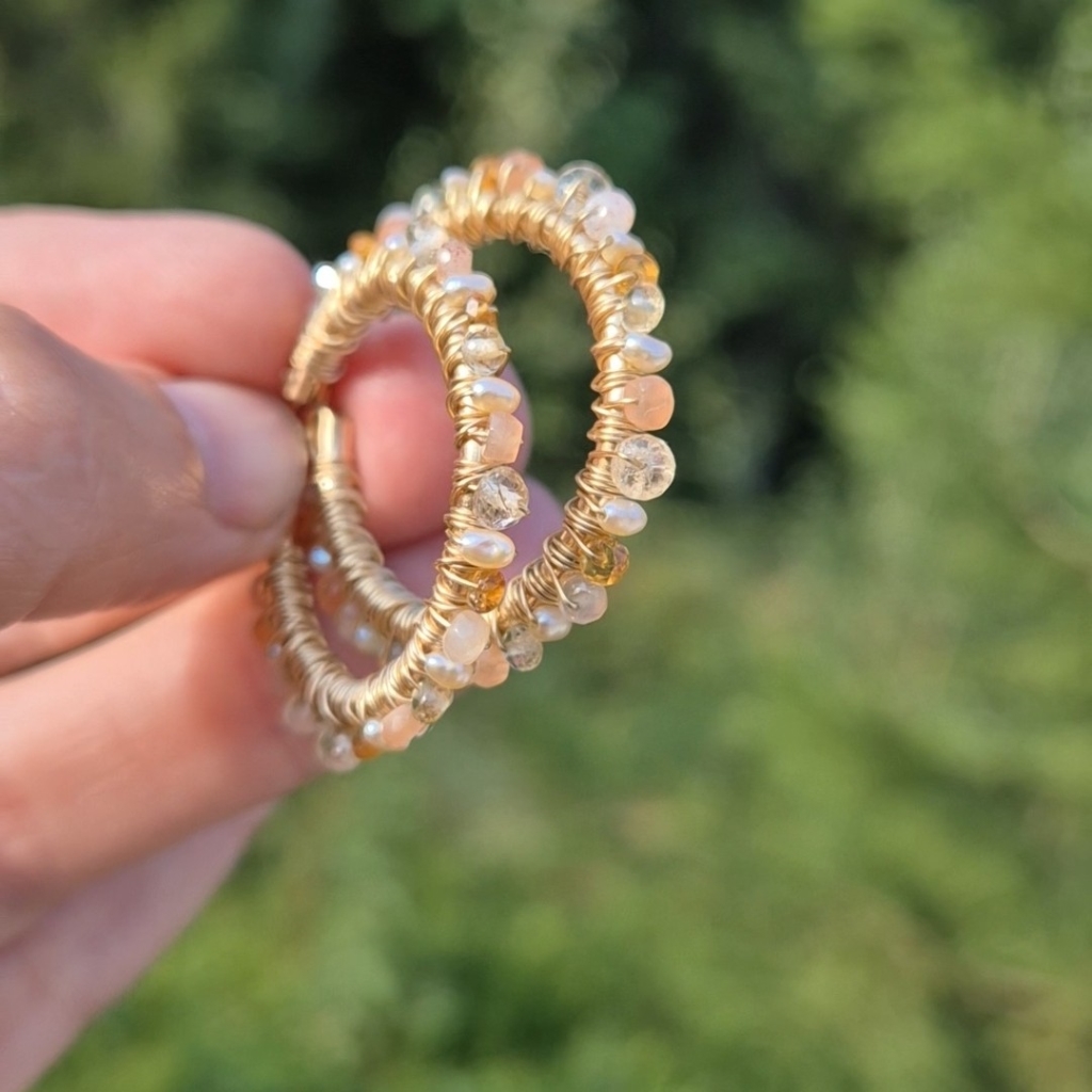 Lekre, store gull øreringer med en krans av oransj-gyllen Perler og Edelstein: Sitrine, Oransj Månestein, og ekslusive Gyllen Rutilert Kvarts . Øreringene har diameter 33mm. Metallet er av 14 Karat Gold-Filled, som er hypoallergisk vennlig og gir et tilnærmet evigvarende lag med gull.