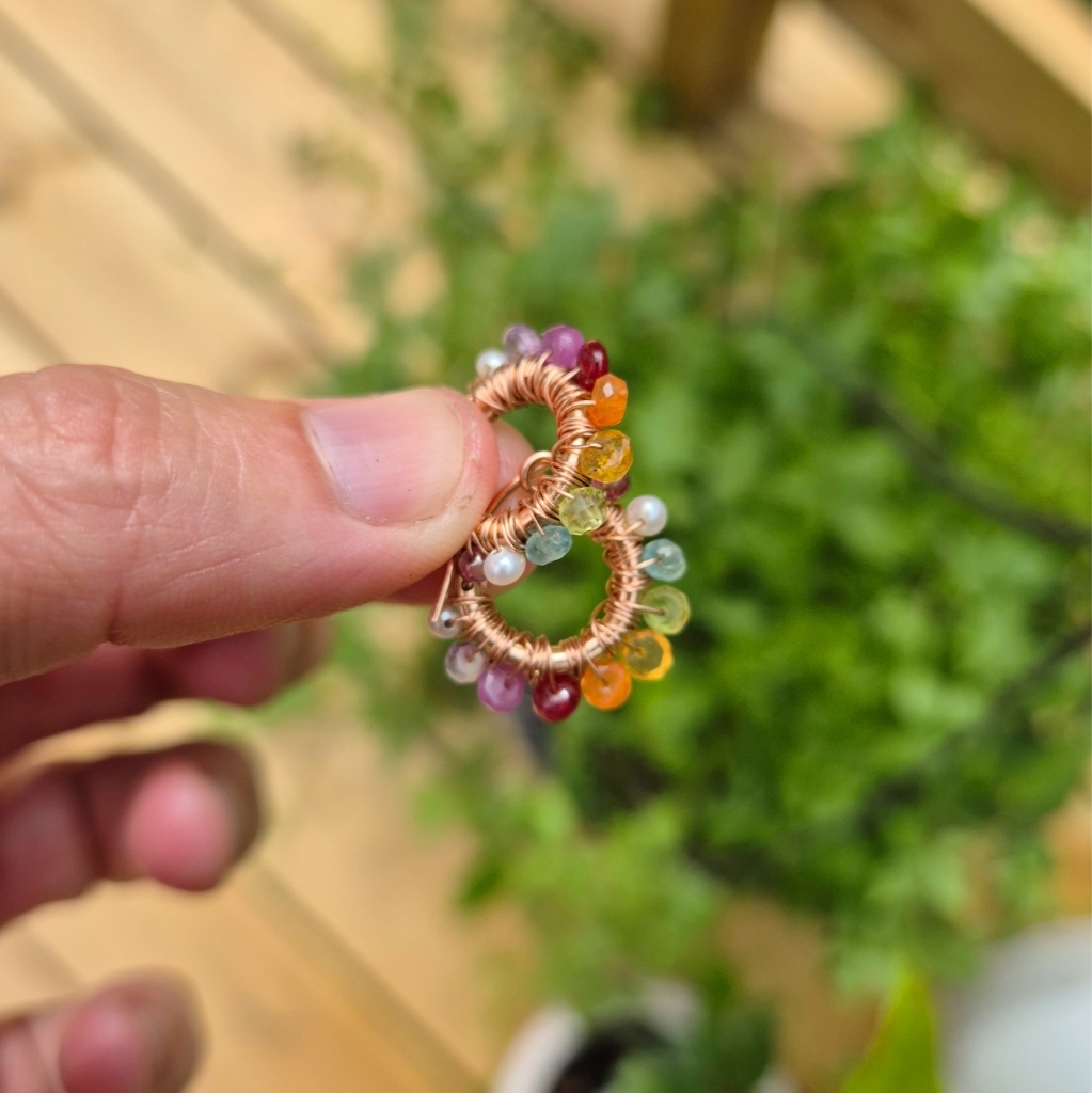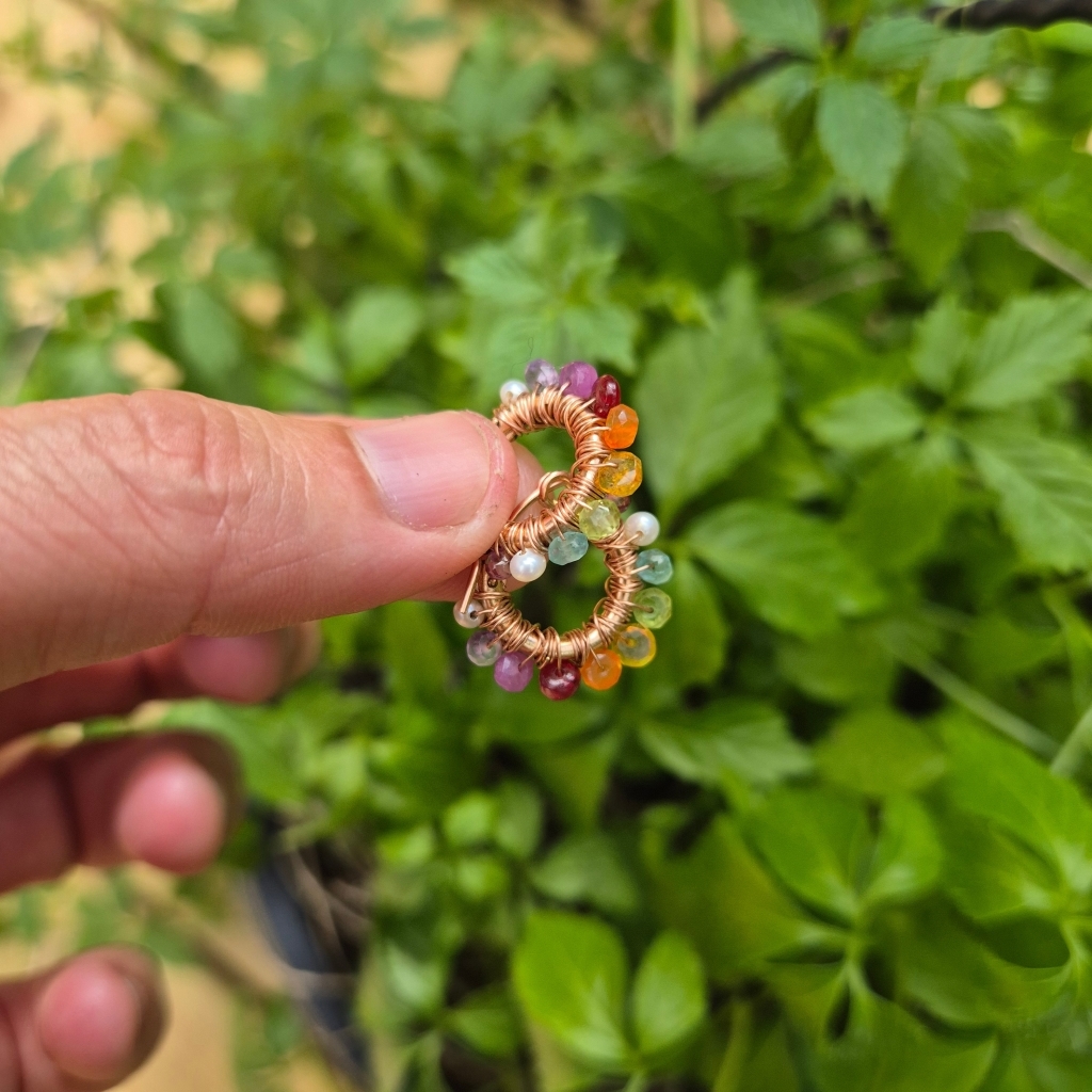 Små skjønne øreringer med krans av Edelstein: hvite Perler, Amazonitt, Peridot, Oransj Månestein, Granat og Sitrine. De har innside diameter 13mm, og er av 14 Karat Gold-Filled i rosegull farget.