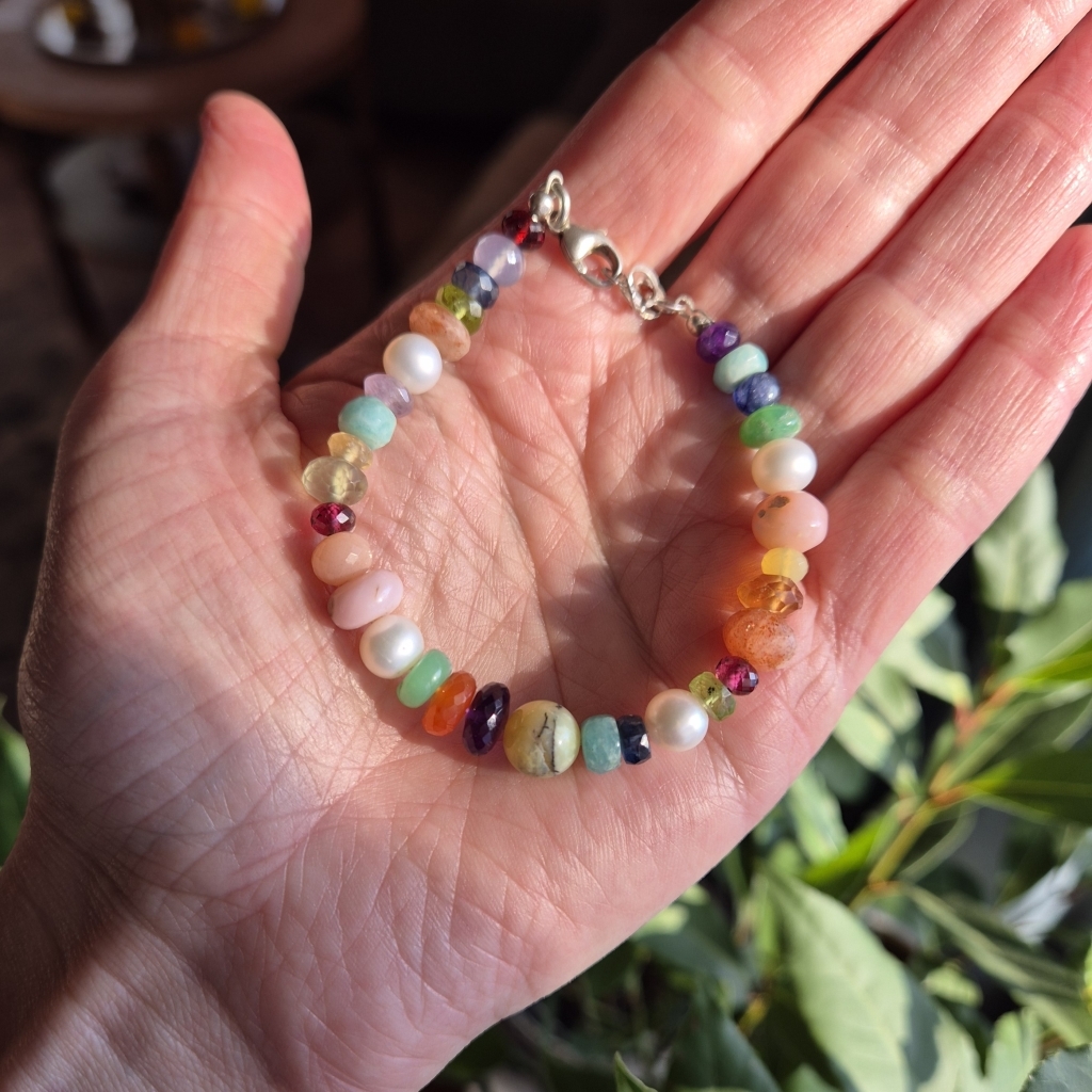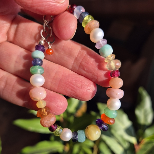 Fargeglad kombinasjon av Perler og Edelstein: Granat, Smaragd, Chalcedon, Rosen Kvarts, Karneol, Kyanitt, Ametyst, Opal, Solstein, Amazonitt, Chrysoprase, Peridot, Frenitt, og Månestein. Størrelse 10 til 4 mm. Lås og materialer ellers er av 925 Sterling Sølv.