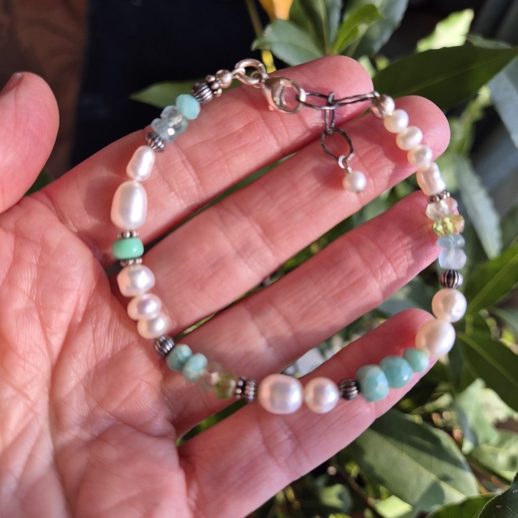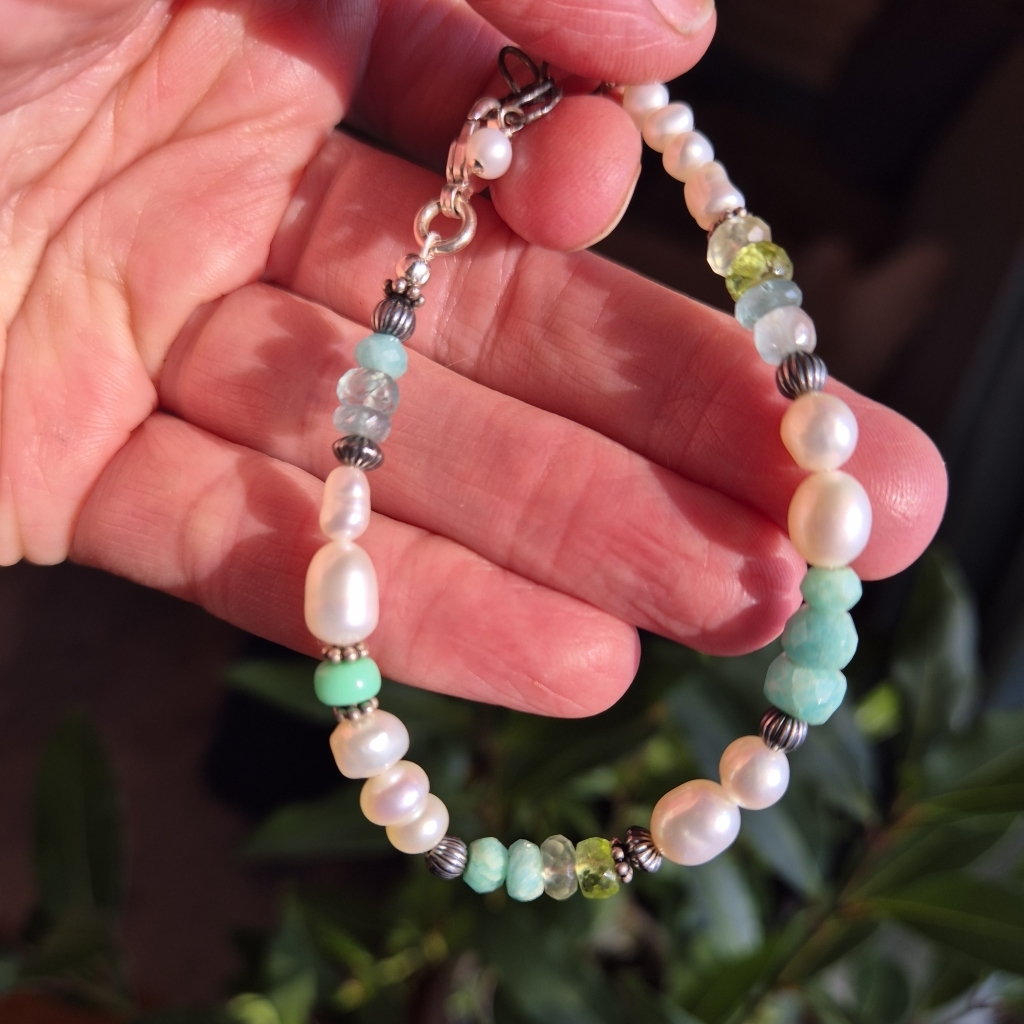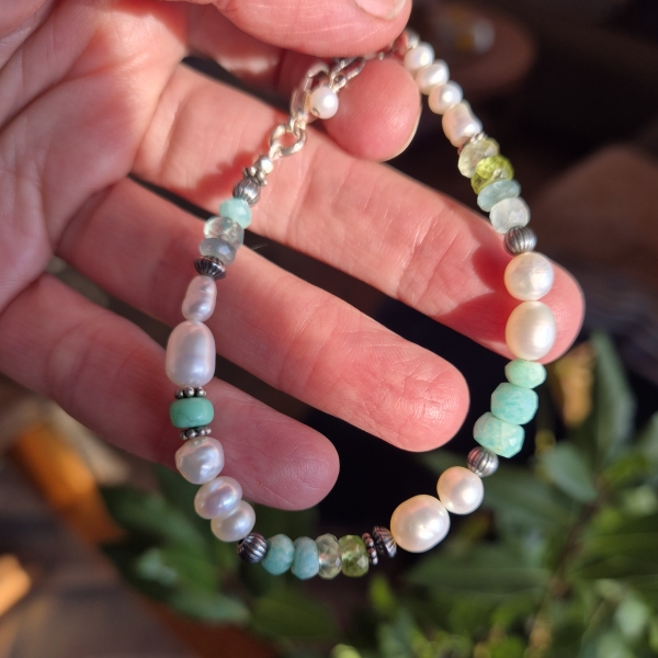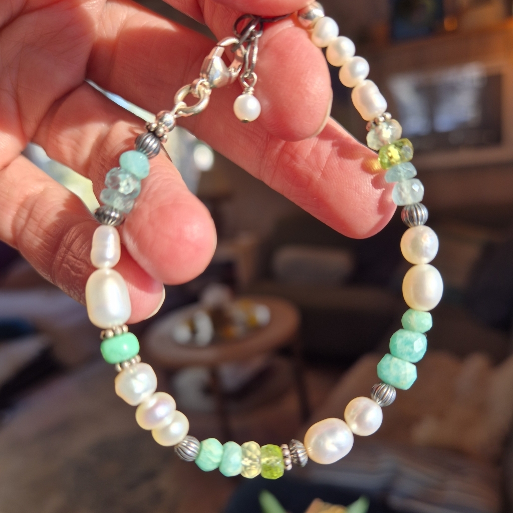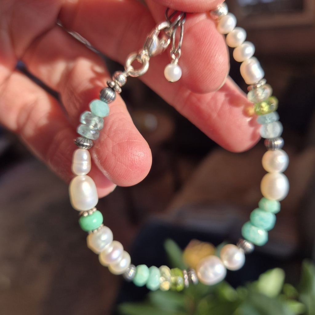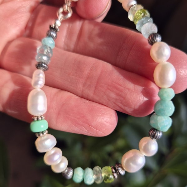 Klassisk hvite Perler og Sterling Sølv, kombinert med Edelstein i turkis og grønn toner: Amazonitt, Chrysoprase, Peridot, Frenitt, Akvamarin og Apatitt. Størrelse 10 til 4 mm.