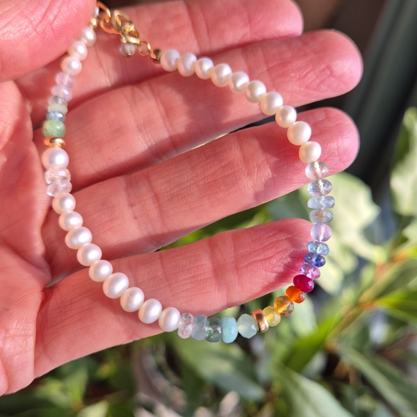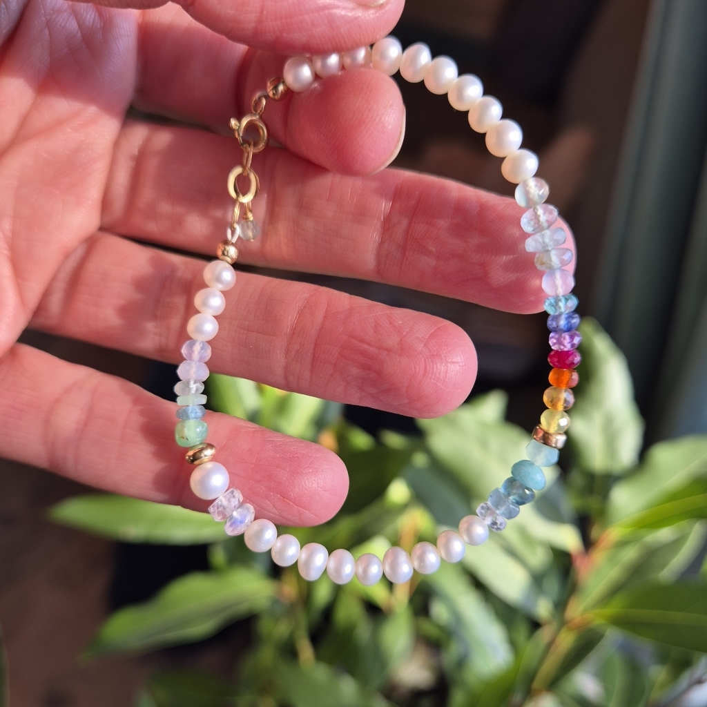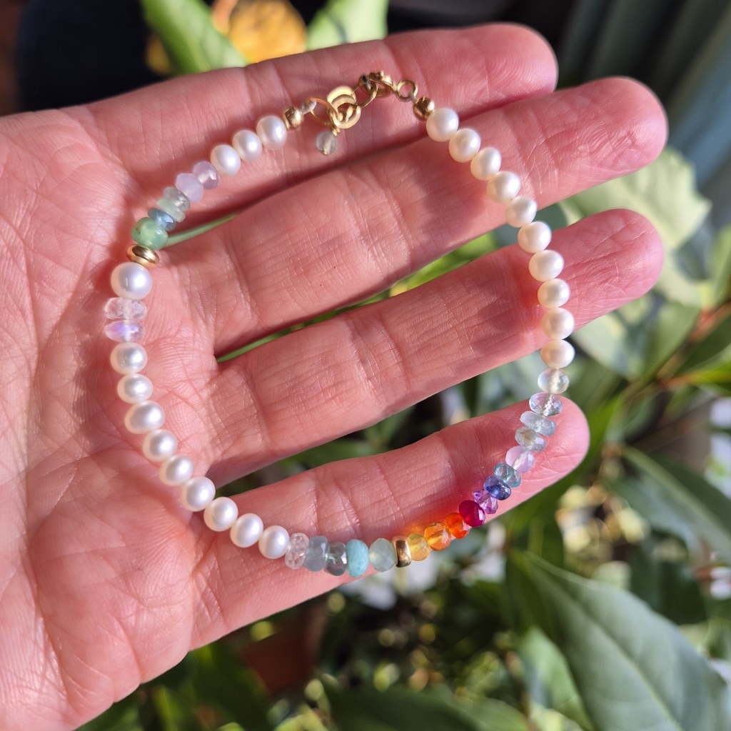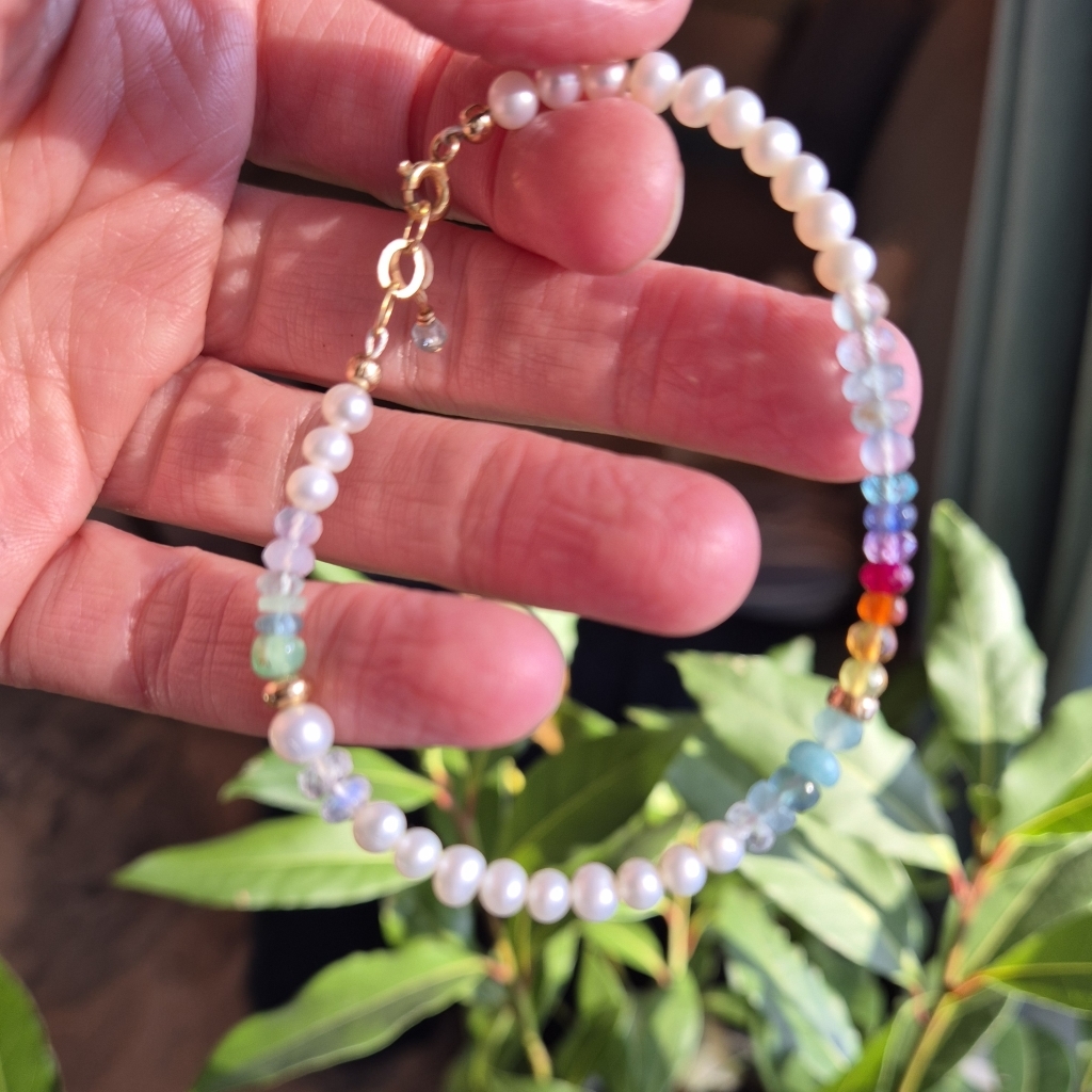 Klassisk hvite Perler sammen med fargerike Edelstein og 14 Karat Gold-Filled detaljer. Du finner følgende Krystaller på armbåndet: Rubin, Ametyst, Smaragd, Karneol, Sitrine, Amazonitt, Apatitt, Frenitt, Akvamarin, Chalcedon og Månestein.