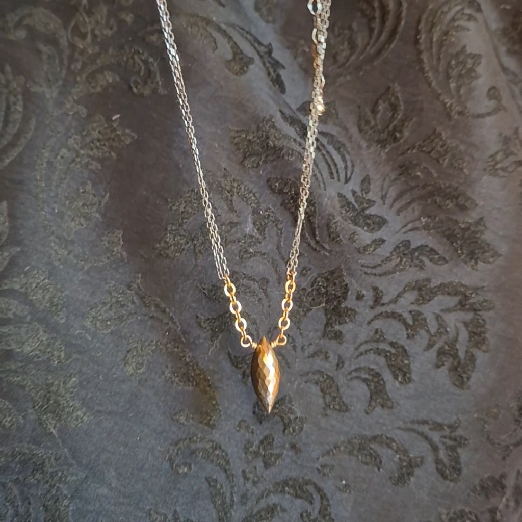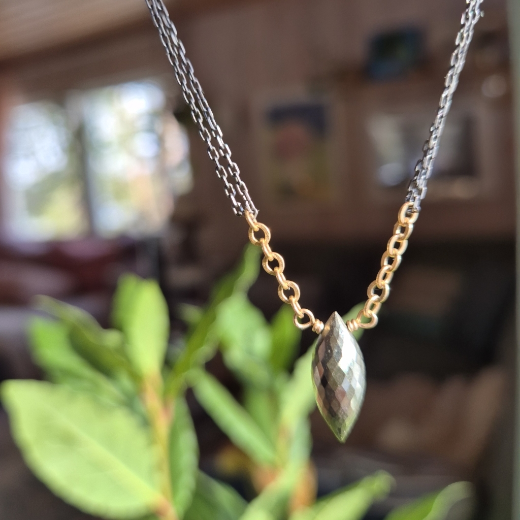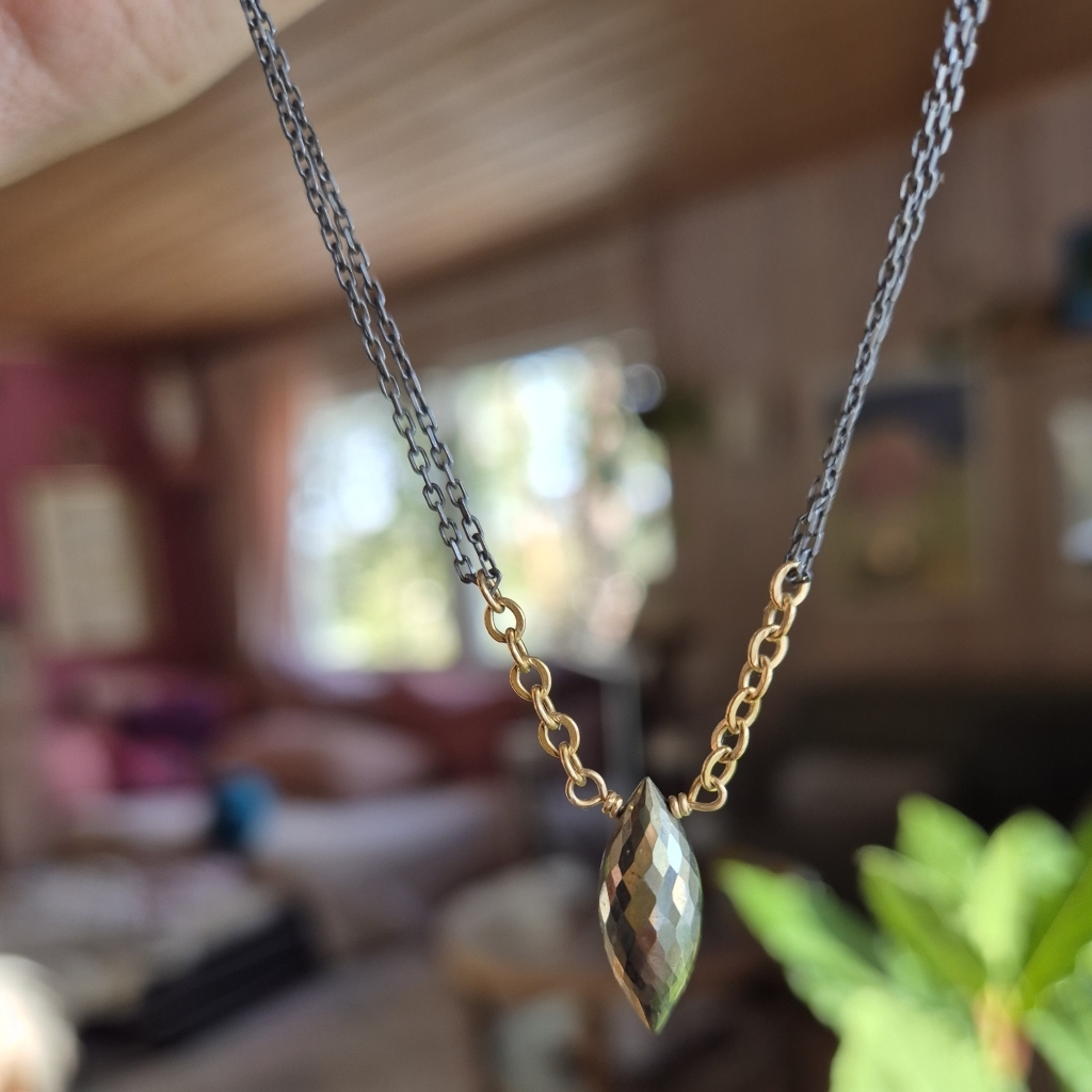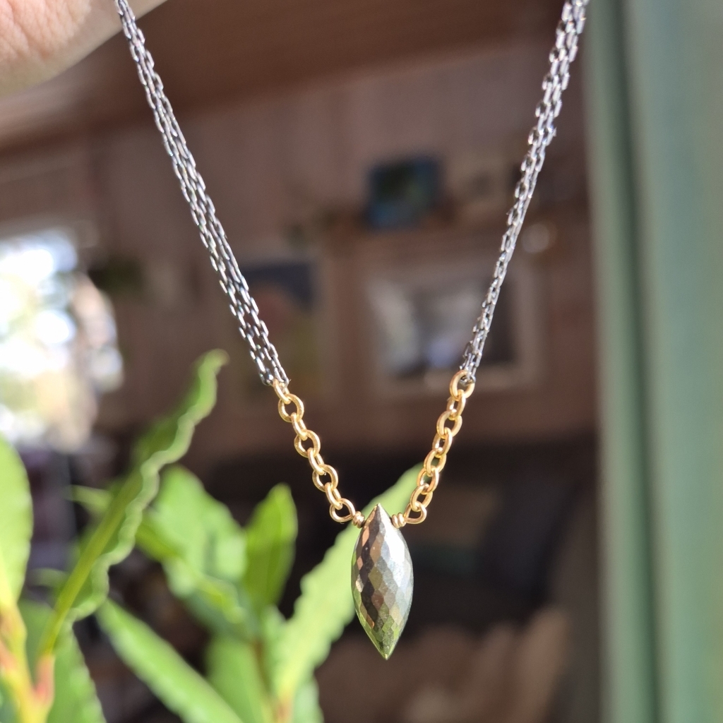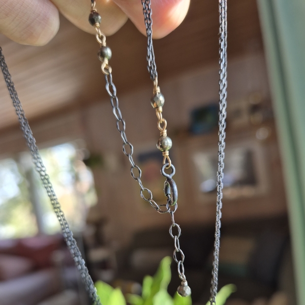 Halskjede med senterpunkt av Pyritt Edelstein- dette er en bronseskinnende stein. Du finner små Pyritt både ved steinen og ved låsen. Kjedet har regularbar lengde 44 til 50 cm og det er av en kombinasjon av oksidert Sterling Sølv og 14 Karat Gold-Filled.