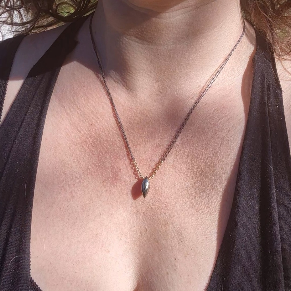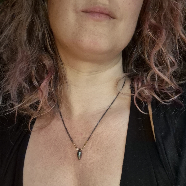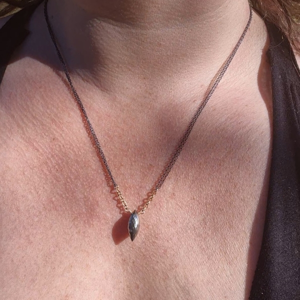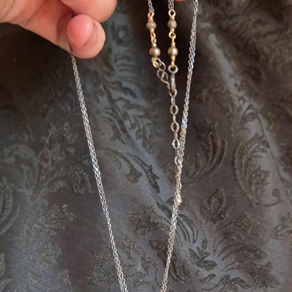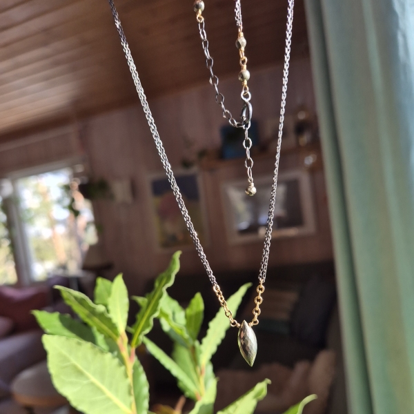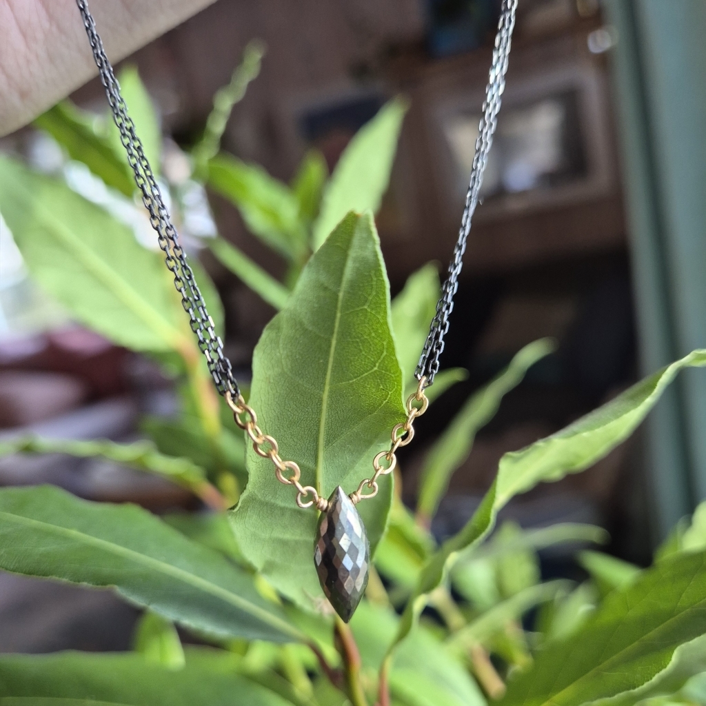 Halskjede med senterpunkt av Pyritt Edelstein- dette er en bronseskinnende stein. Du finner små Pyritt både ved steinen og ved låsen. Kjedet har regularbar lengde 44 til 50 cm og det er av en kombinasjon av oksidert Sterling Sølv og 14 Karat Gold-Filled.