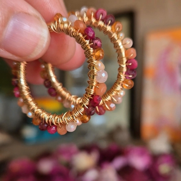 Store vakre fargerike, av Perler og Edelstein i rosa nyanser med innslag av oransj: Rubin, Granat, Månestein og Karneol.