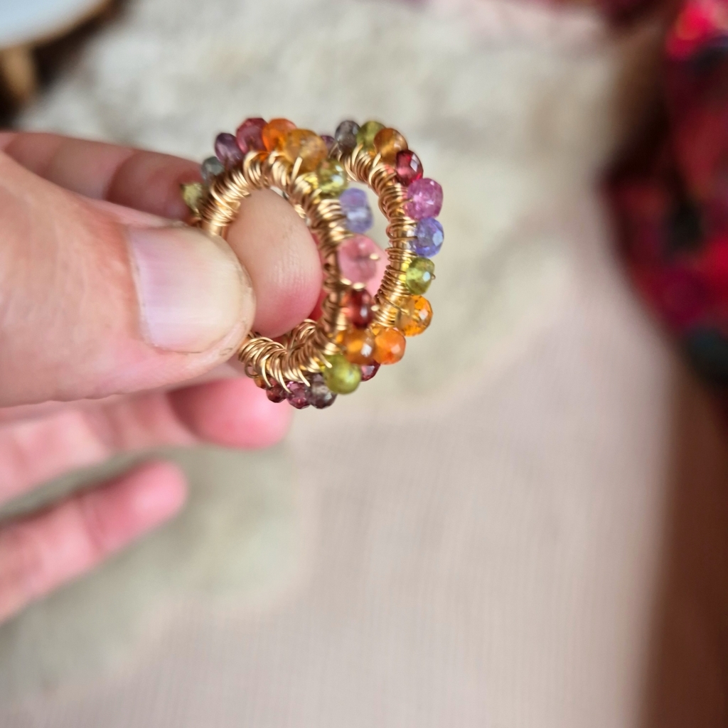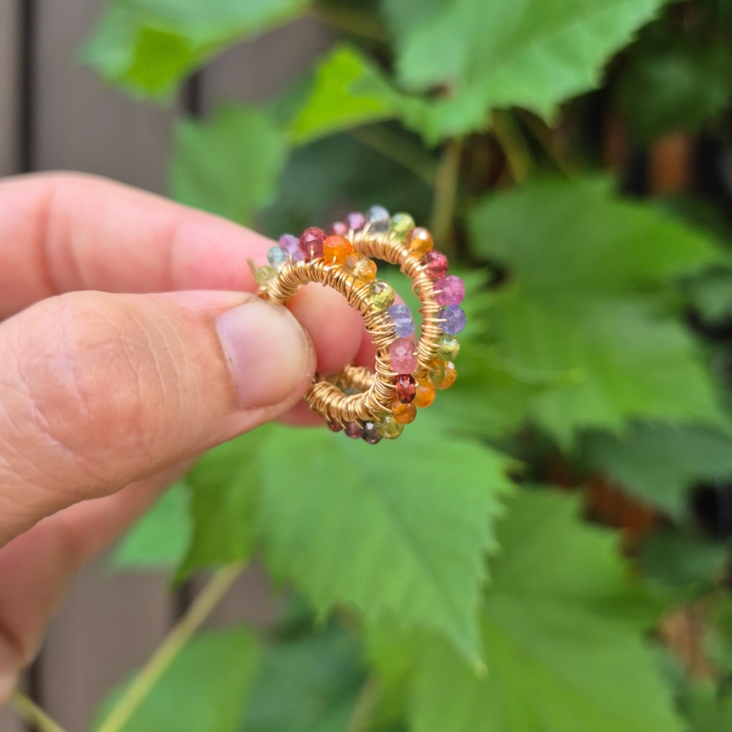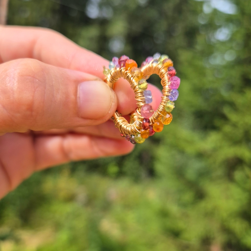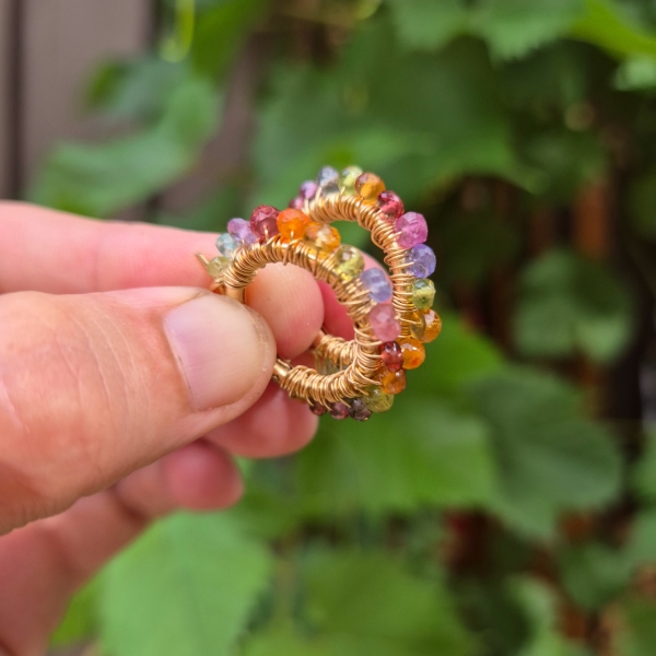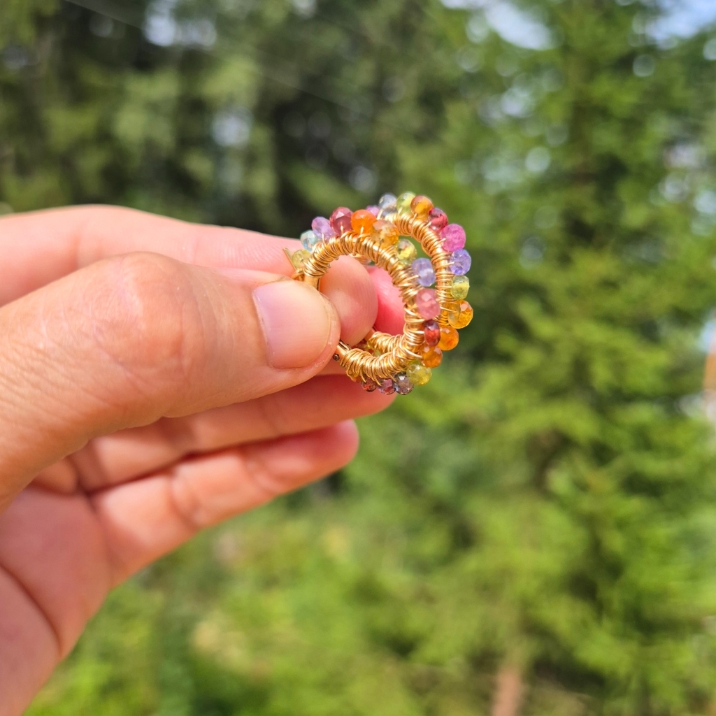 Mangefarget gylne øreringer med krans av Edelstein av Rosa Safir, Ametyst, Granat, Peridot, Tanzanitt, Iolitt og Sitrine.