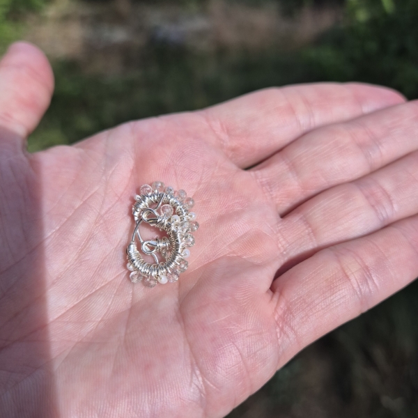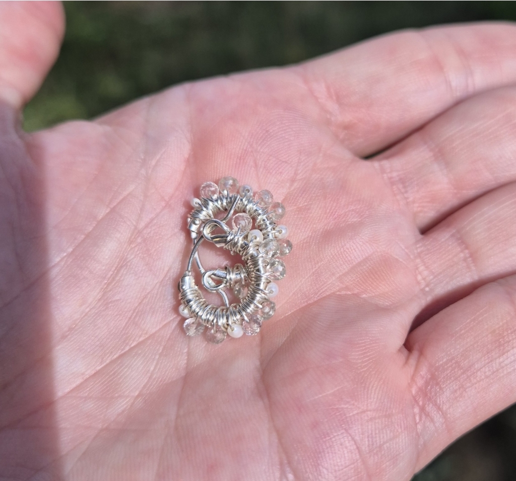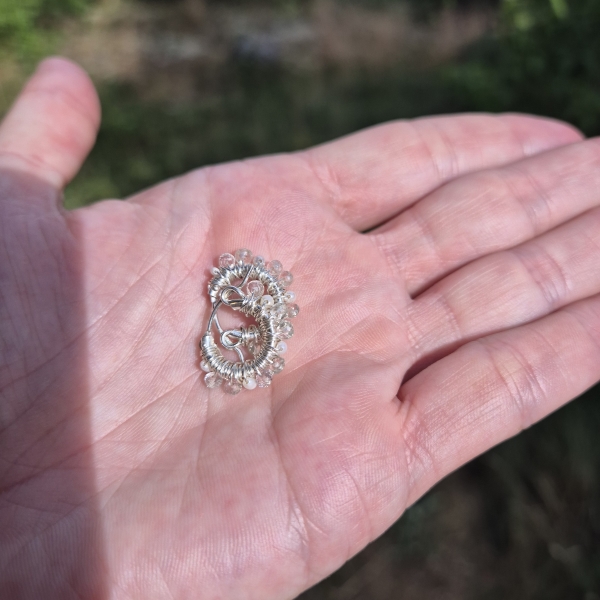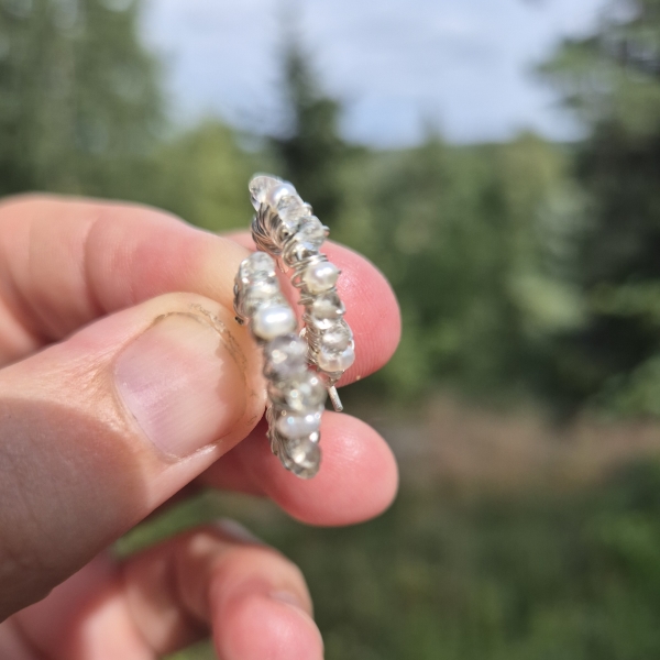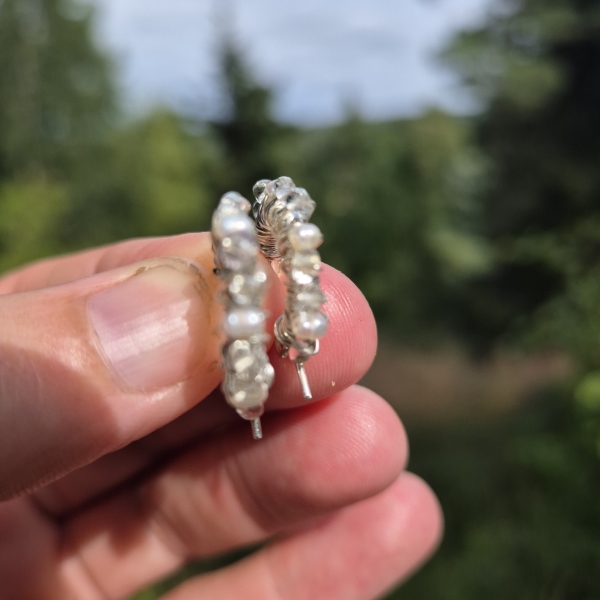 Klar Bergkrystall, små hvite Perler og Sterling Sølv. Dette er øreringer som du kan "leve med" i ørene. Dameter er 15mm.