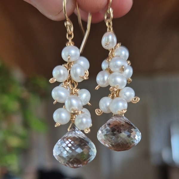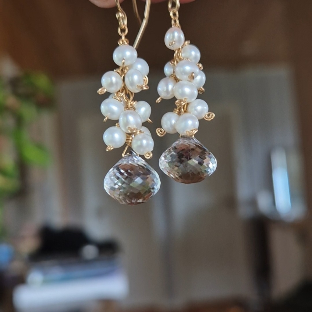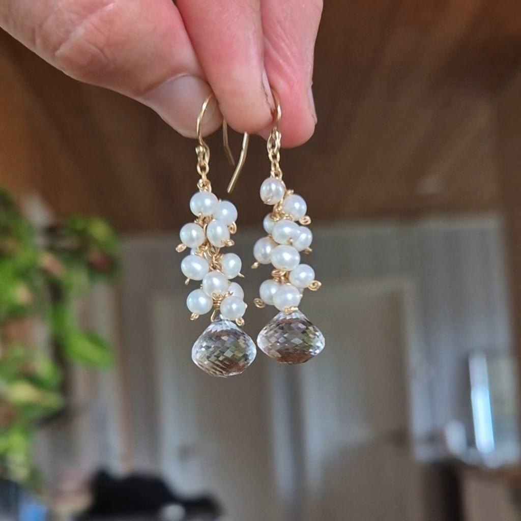 Vakker helt klar Bergkrystall Edelstein i beste kvalitet sammen med dryss av hvite Perler oppover. Dem har lengde 4,6 cm og er er av 14 Karat Gold-Filled.