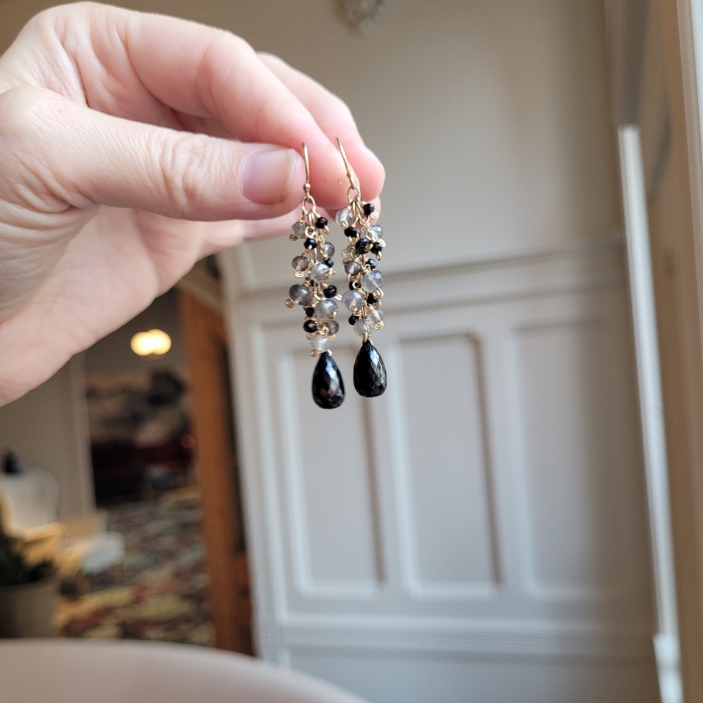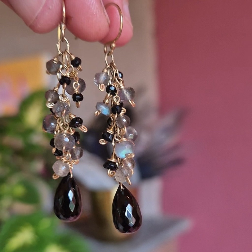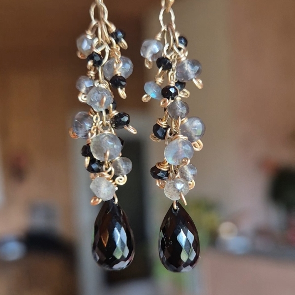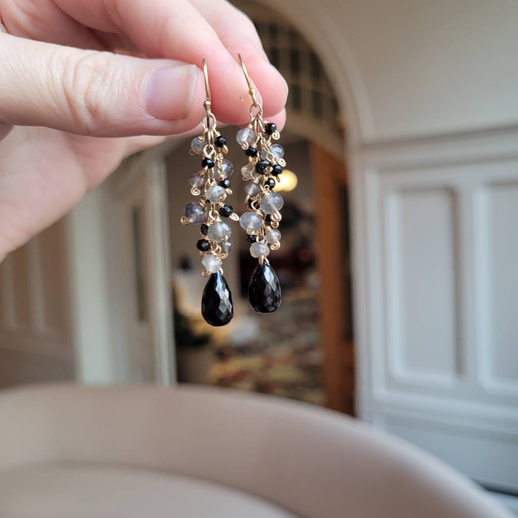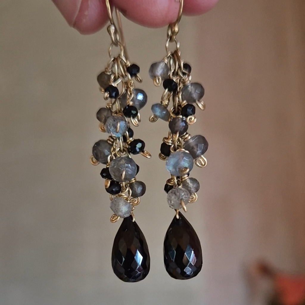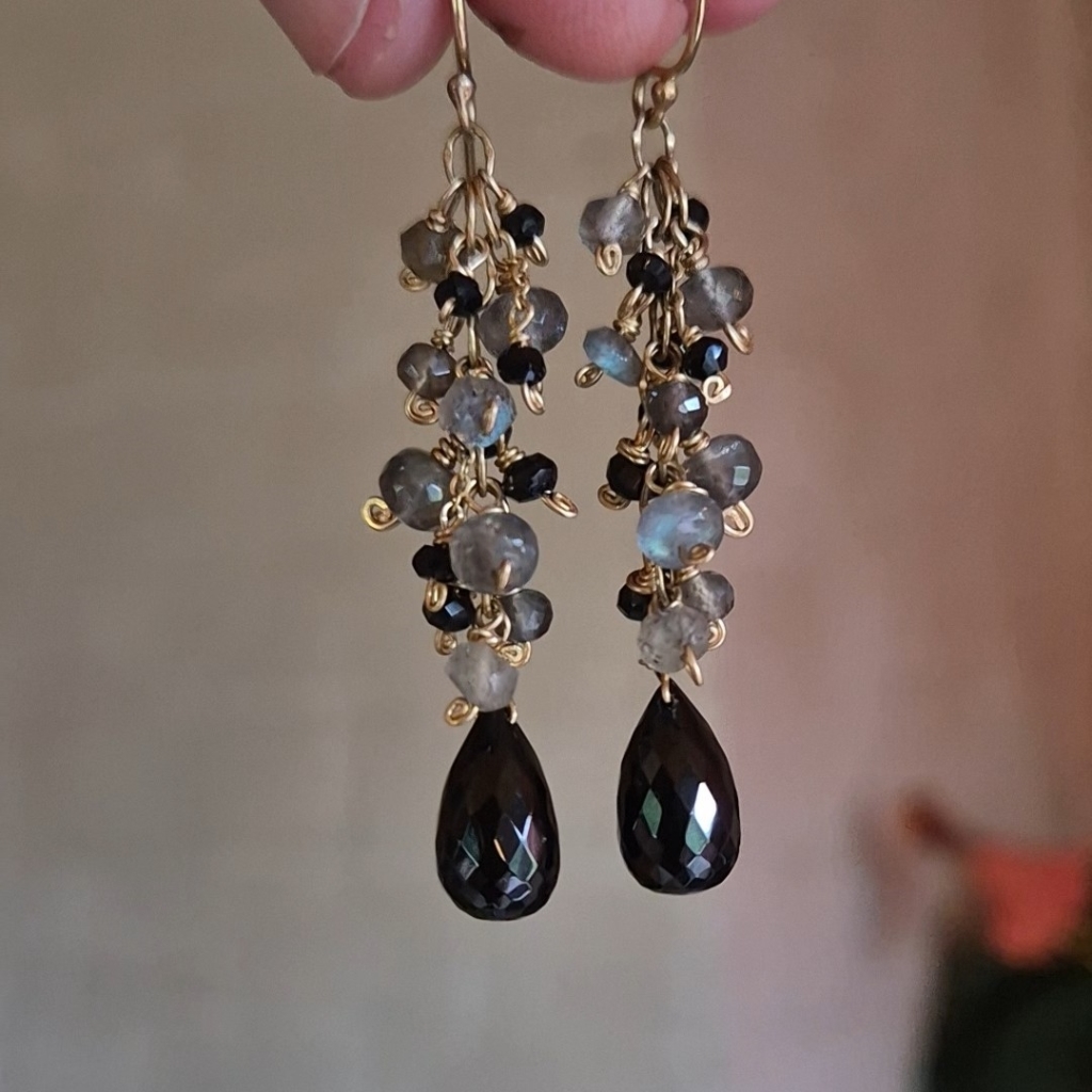 Svart Spinell dråper og små steiner, i kombinasjon med grå Labradoritt og Svart Månestein. Øredobber har lengde 5,3 cm og er er av 14 Karat Gold-Filled. Dråpene er 12mm.