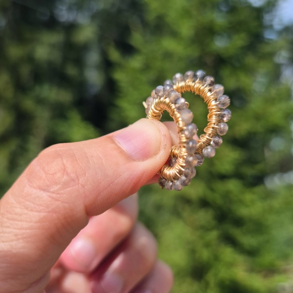 All Månestein Edelstein har et helt spesielt skinn i overflaten. Her er en spennende kombinasjon av grå-svart Månestein sammen med gull.