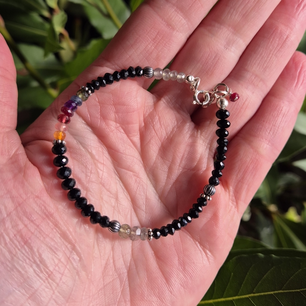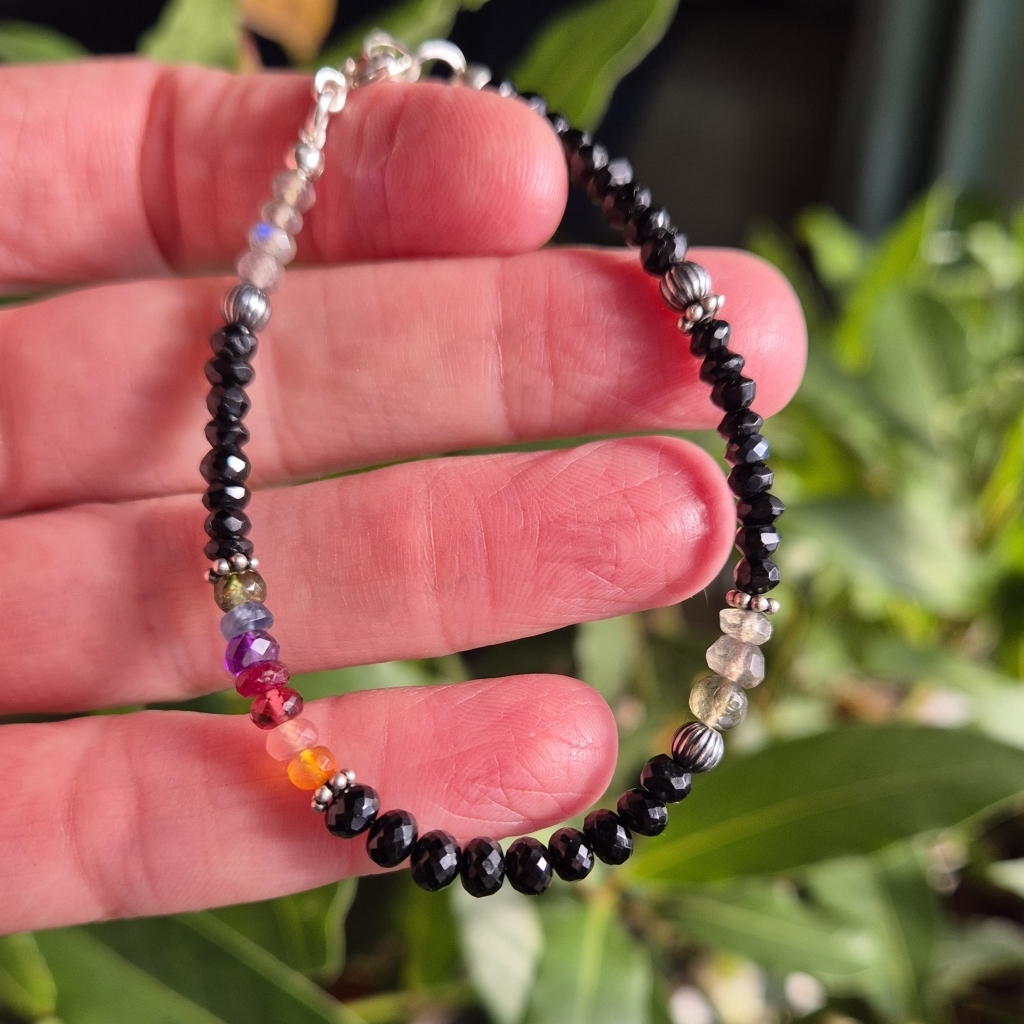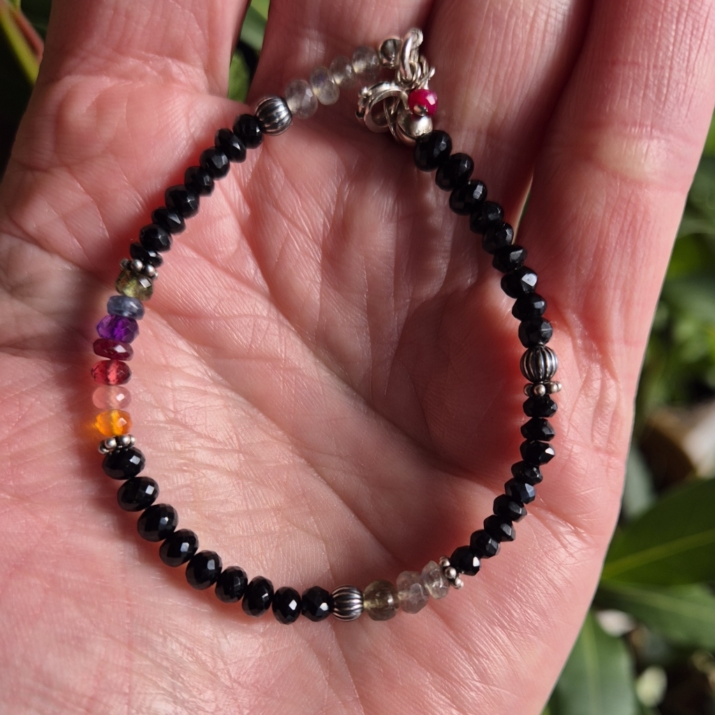 Svart Spinell er en Edelstein som er antatt å være sterk beskyttende. Armbåndet er i Sterling Sølv, og har også Edelstein av: Labradoritt (intuisjon), Rubin, Ametyst, Granat, Karneol, Rhocrositt, Safir og Smaradg.