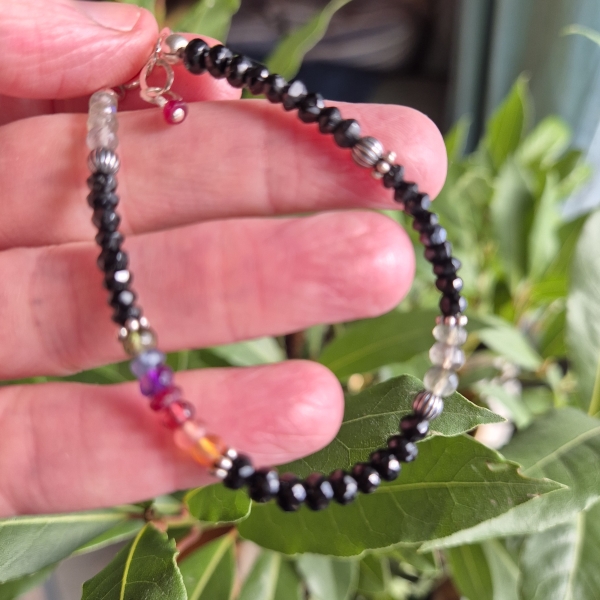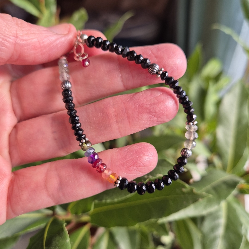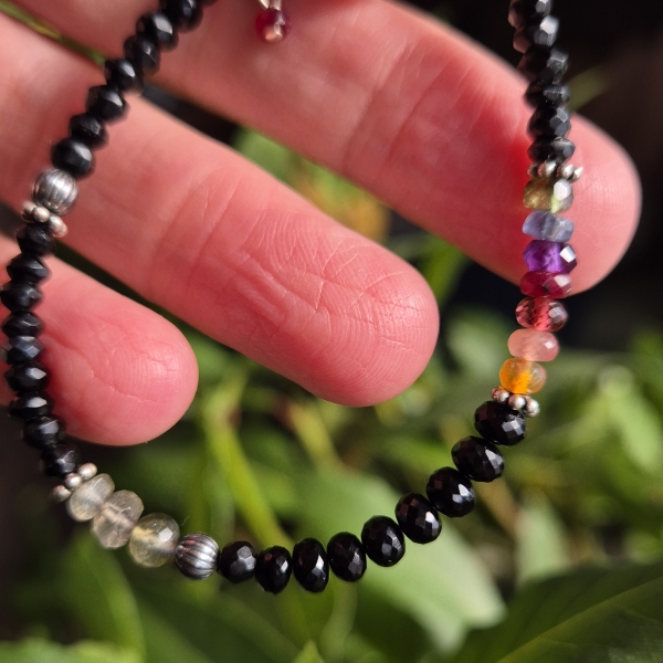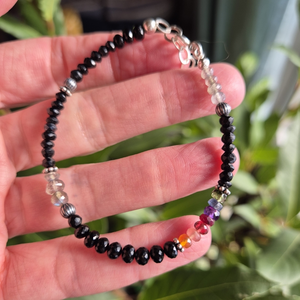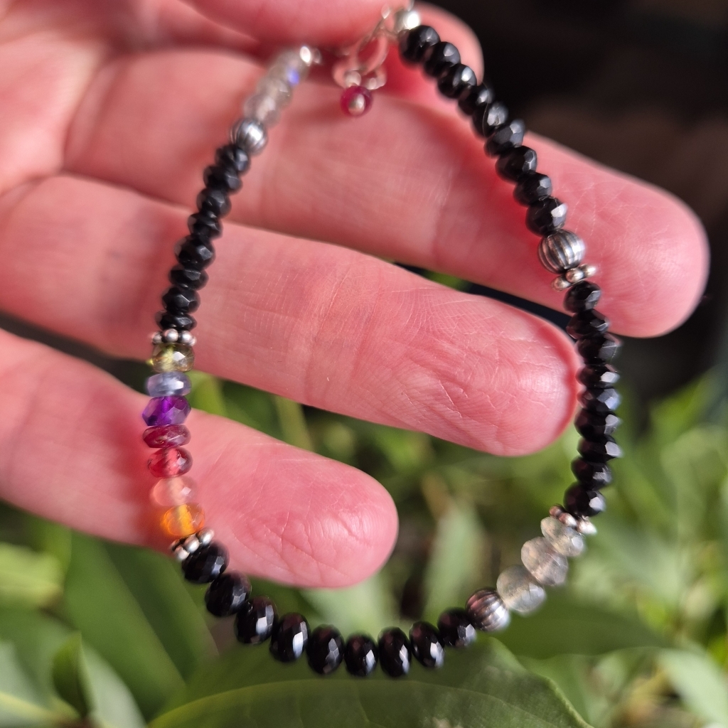 Svart Spinell er en Edelstein som er antatt å være sterk beskyttende. Armbåndet er i Sterling Sølv, og har også Edelstein av: Labradoritt (intuisjon), Rubin, Ametyst, Granat, Karneol, Rhocrositt, Safir og Smaradg.