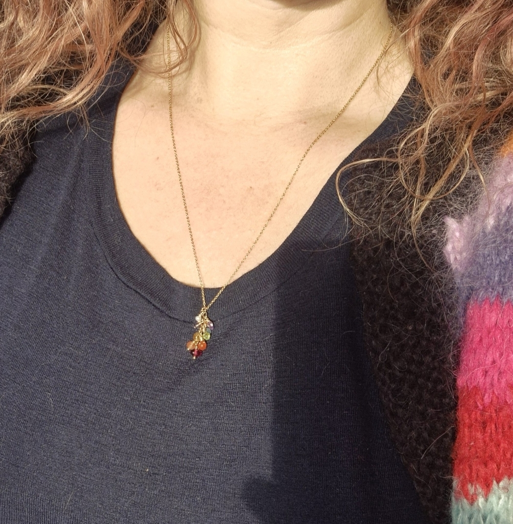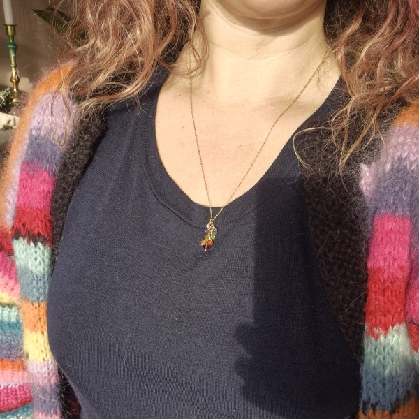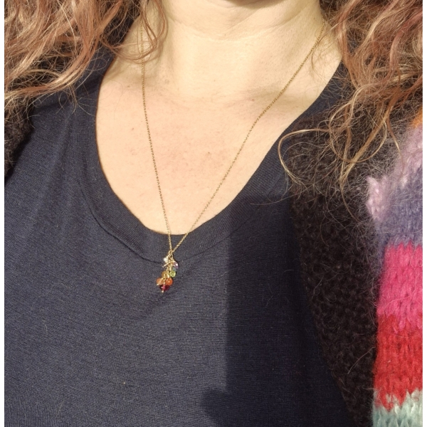 Delikat og samtidig detaljrikt kort halssmykke med Edelstien av: Granat, Solstein, Karneol, Sitrine, Peridot, Akvamarin, Iolitt, Ametyst og en hvit Perle. Den største steinen er 4 mm