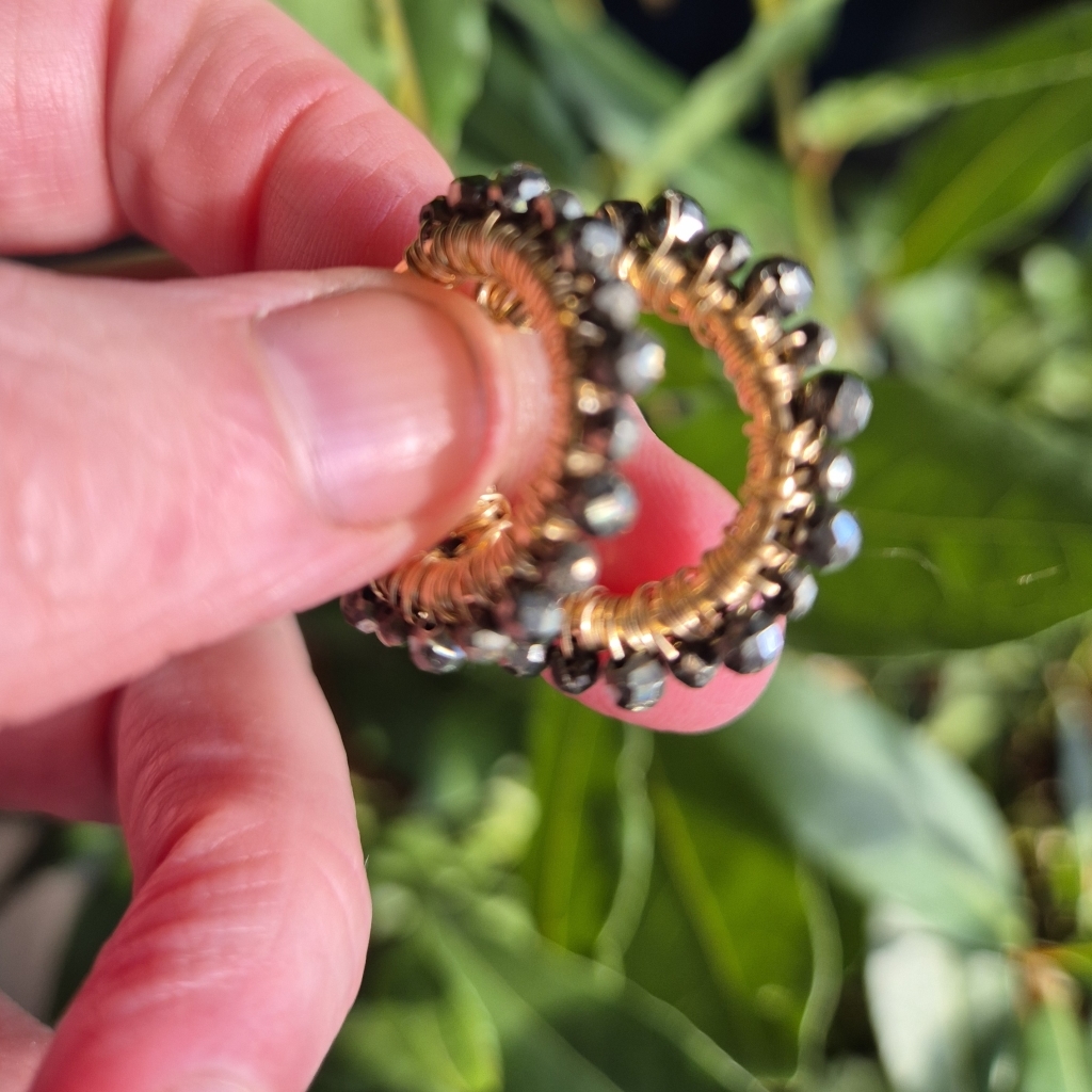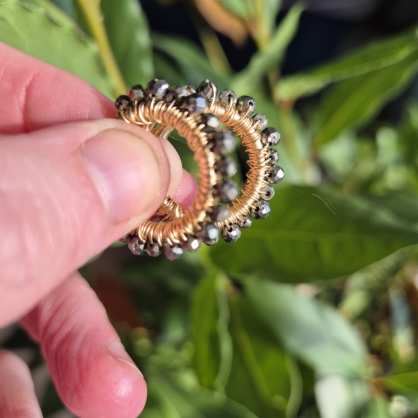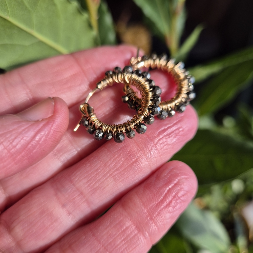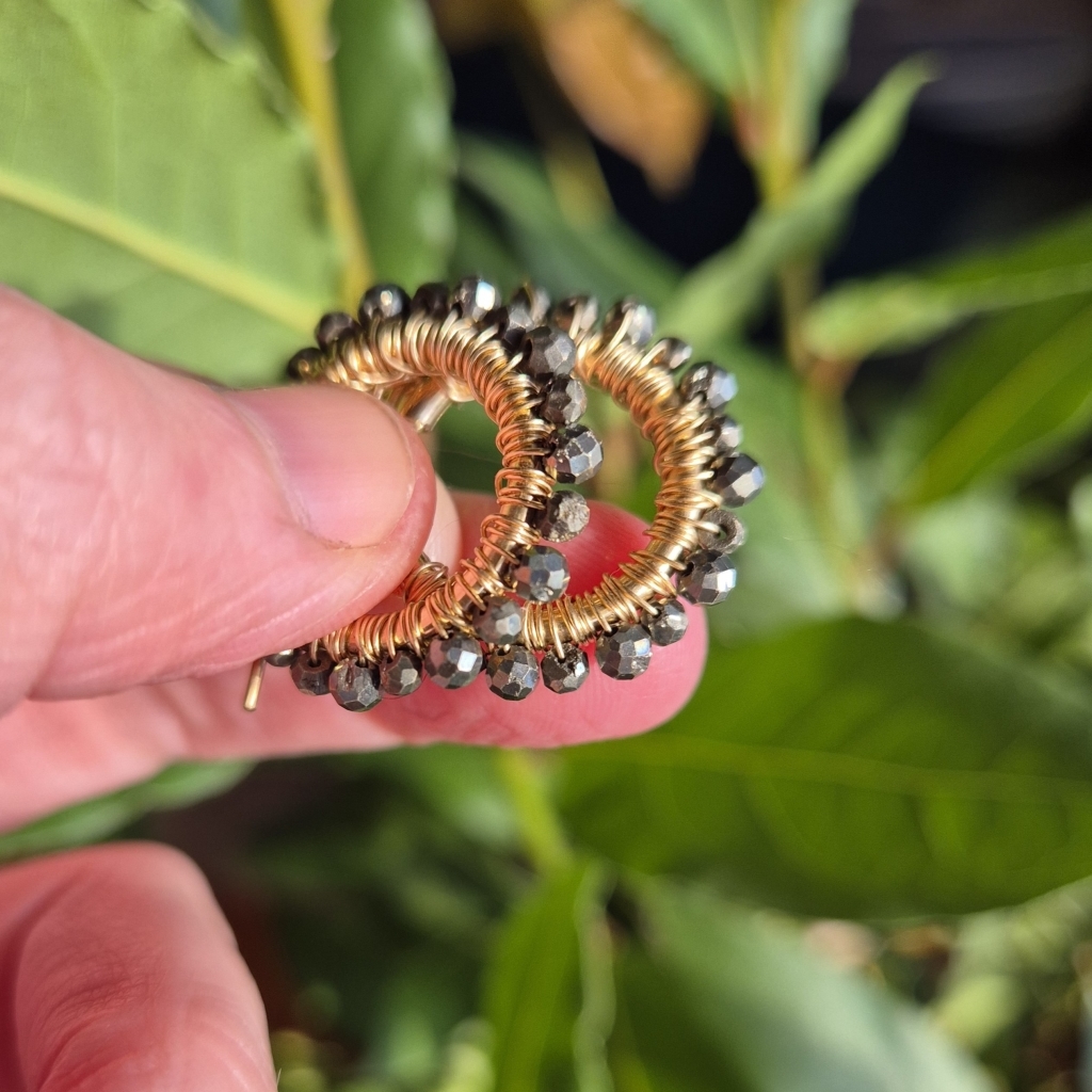 Pyritt er en bronse-skinnende Edelstein, her tvinnet i en krans omkring gulløreringer som har innside diameter 18 mm, ytterste kant er 22 mm. Metallet er av 14 Karat Gold-Filled, som er hypoallergisk vennlig og gir et tilnærmet evigvarende lag med gull